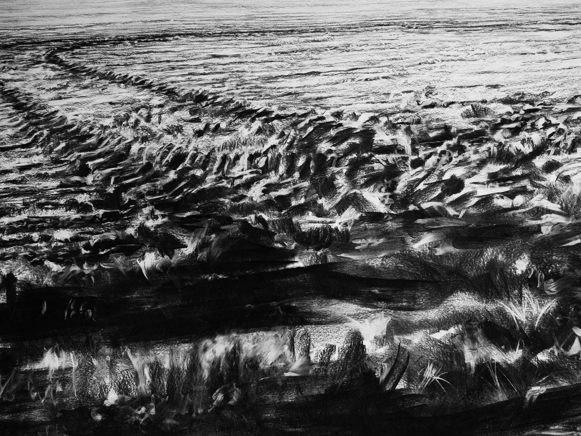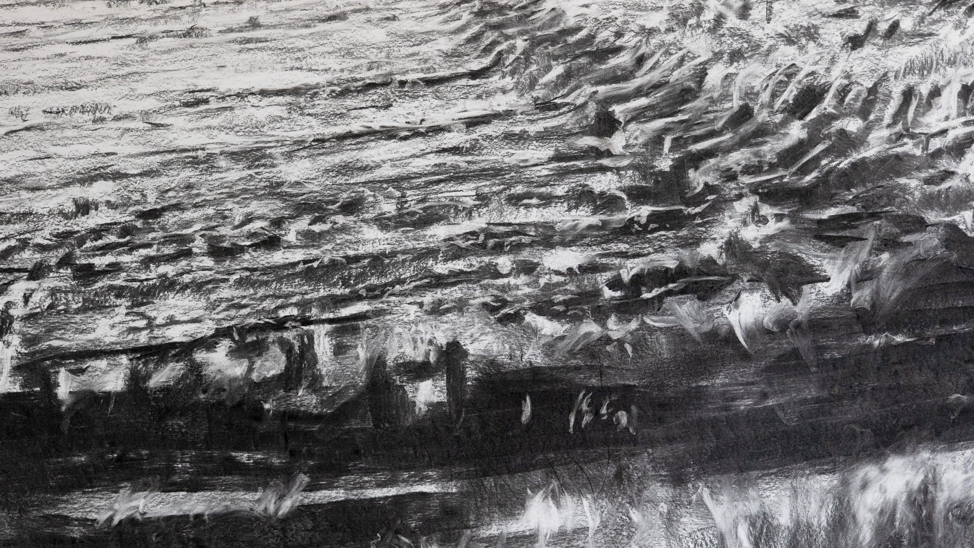 Dessiner au fusain c’est creuser dans les formes et leur surface, creuser en frottant la page."